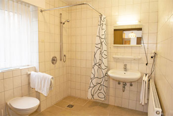 Unser Haus besitzt einen barrierefreien Eingang und 15 Zimmer im Erdgeschoss mit unterfahrbaren Duschen und WC mit Haltegriffen an der linken oder rechten Seite. Der schmalste Durchgang beträgt 90 cm und der Zugang zu den Badezimmern erfolgt durch Schiebetüren. Des Weiteren stehen Ihnen 15 Zimmer mit flacher Duschtasse im Ober- bzw. im Dachgeschoss zur Verfügung. Auch hier werden Sie Haltegriffe vorfinden.